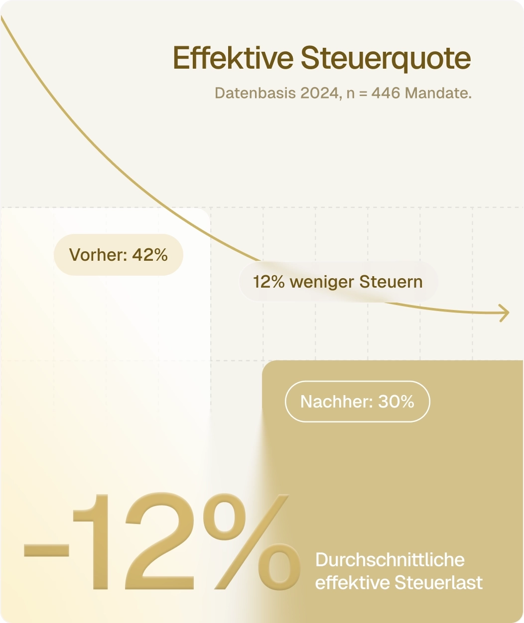Wir helfen dir, deine effektive Steuerquote zu senken, versteckte Potenziale zu aktivieren und eine Struktur aufzubauen, die für dich und nicht für den Staat arbeitet.